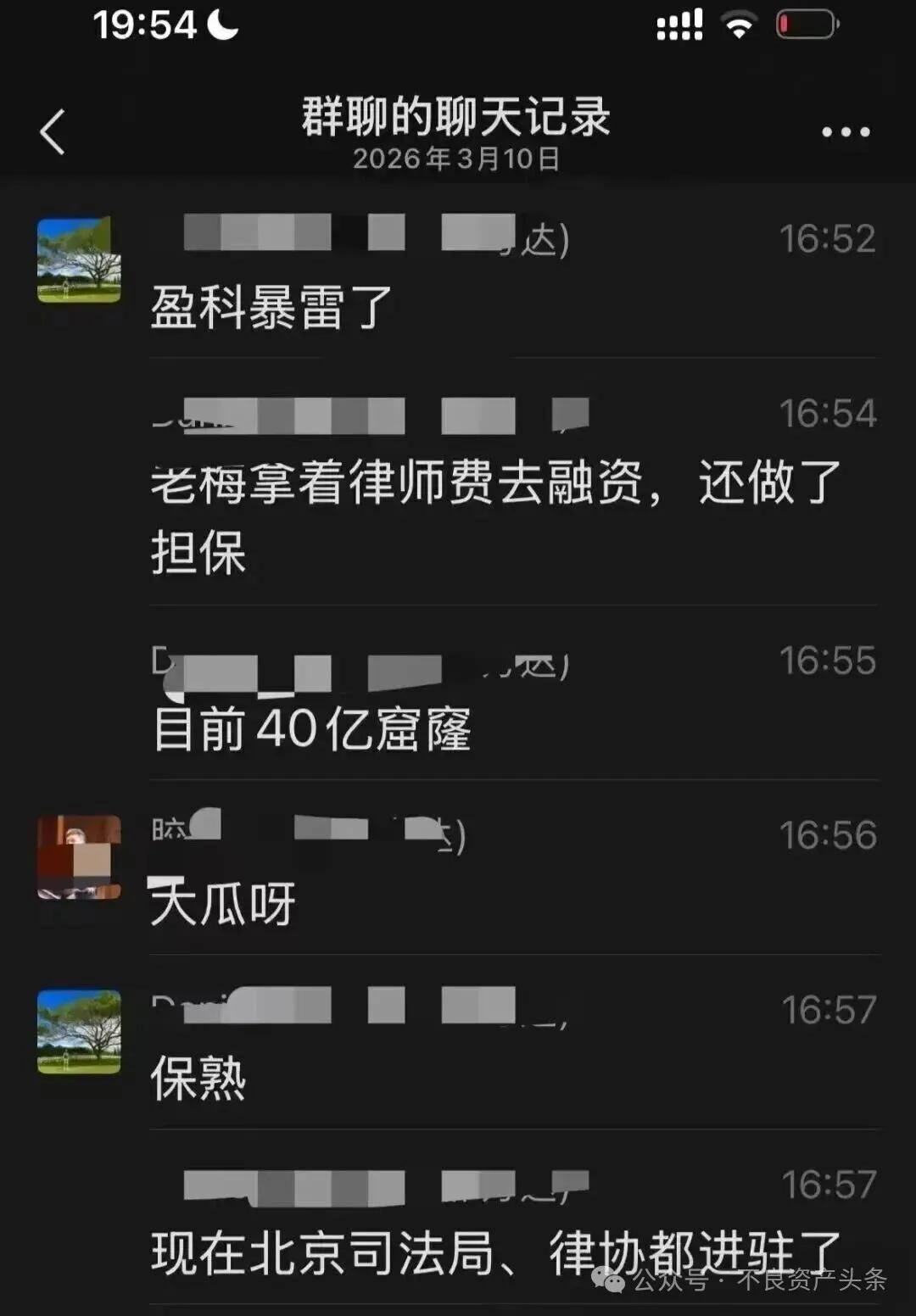 网传截图显示“盈科暴雷了”“老梅拿着律师费去融资,还做了担保”“目前40亿窟窿”等信息。此群聊信息,意味着盈科老板梅向荣(人称老梅)拿着律师费去融资并担保暴雷,目前涉及40亿窟窿。现在,北京司法局、律协都进驻(北京盈科律所)了。