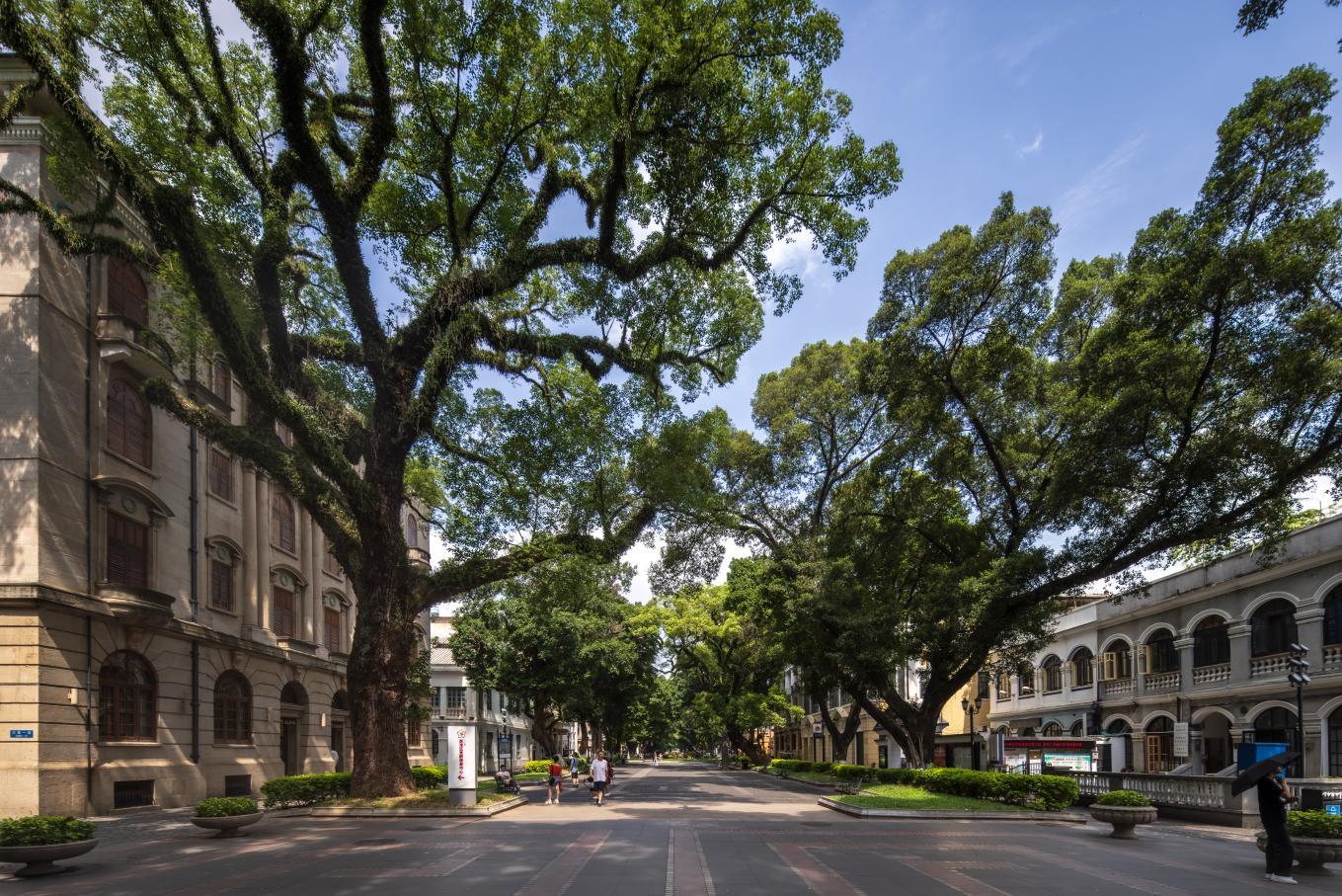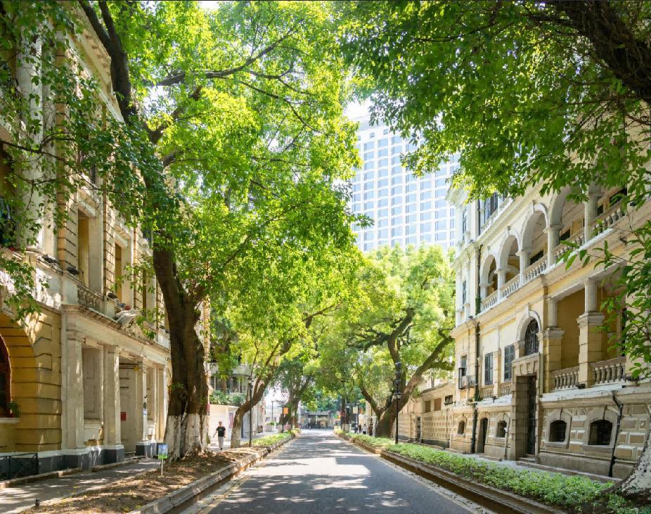 如今的沙面,早已不是旧时模样,而是历史与潮流交织的生动舞台。岛上现存150多座欧洲风格建筑,涵盖新巴洛克式、仿哥特式、券廊式、新古典式及中西合璧等多种风格,其中50余栋已被列为全国重点文保单位。葱郁的绿意更是沙面的一大亮点,全岛有700多棵大树,包括137棵古树名木,是广州中心城区古树密度最高的区域之一,浓荫之下随手一拍都是大片。
